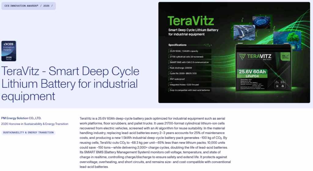 PM Energy Solution has been recognized as a 2026 CES Innovation Awards® Honoree in the Sustainability & Energy Transition category for its product, “TeraVitz – Smart Deep Cycle Lithium Battery for Industrial Equipment.”